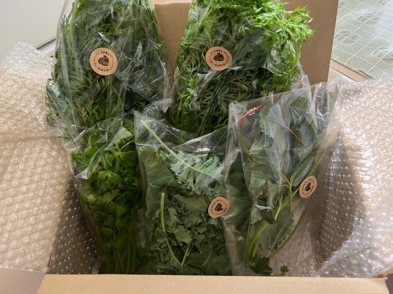人参葉100gと季節ごとに変わるお野菜を含むお試しセット4種類、ミニサイズドライリーフ